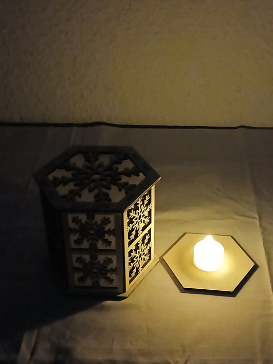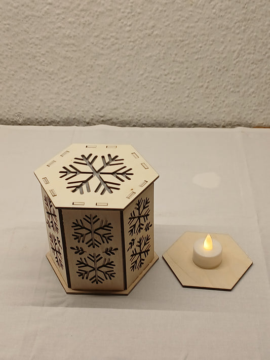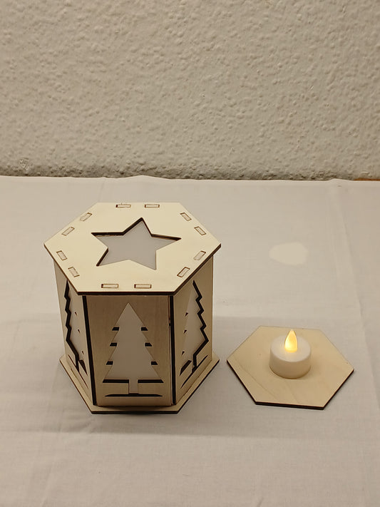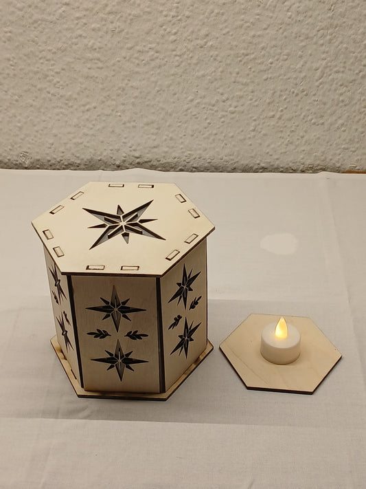 "Handgefertigte Holzlaterne mit Sternmuster und LED-Teelicht"